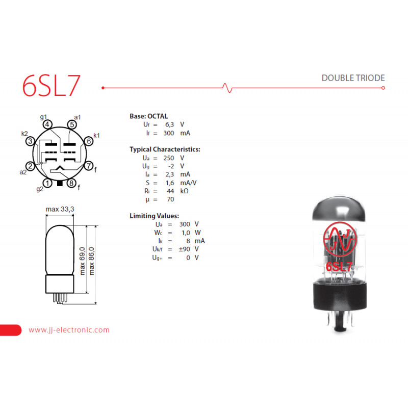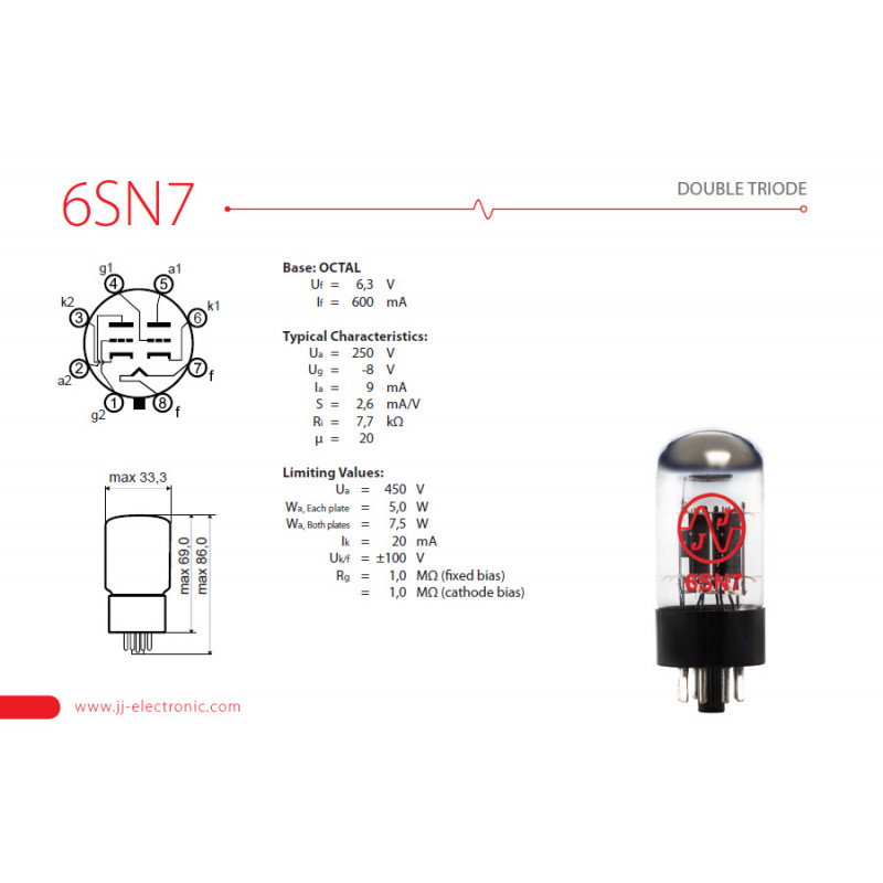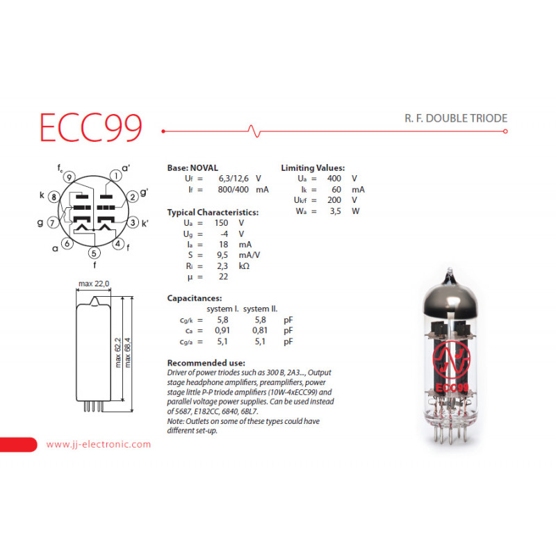 ECC82 is 12AU7 medium gain pre-amplifying double triode. Provides a very smooth sound with well-defined tones suitable for audio and guitar amplifiers.