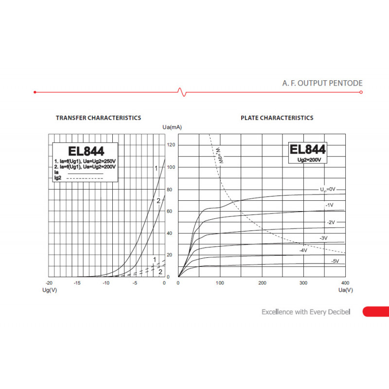 EL844 is a lower power version of EL84. It reduces headroom by approximately 25% which allows it to achieve overdrive at lower volume levels.